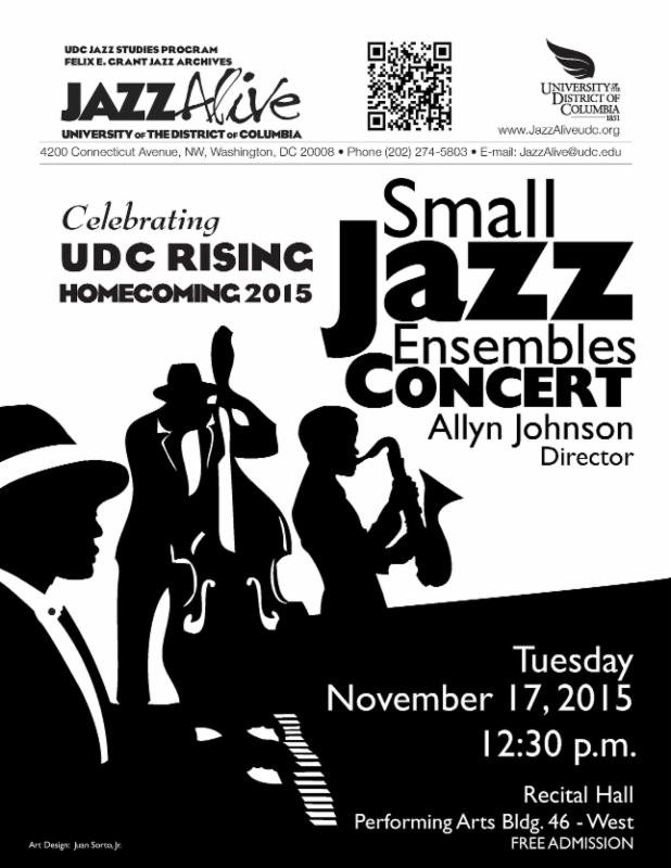 UDC Recital Hall - Van Ness Campus Performing Arts (Bldg. 46-West) Join the jazz ensembles under the direction of Allyn Johnson for our UDC Homecoming 2015 celebration. |